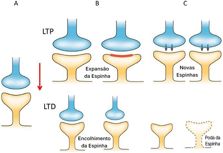 (A) Antes da aplicação da estimulação elétrica ao neurônio pré-sináptico (azul), as espinhas dendríticas encontram-se em um estado calmo e equilibrado. (B) Após a estimulação elétrica ao neurônio azul, um fenômeno chamado potenciação de longo prazo (LTP) ocorre nas espinhas dendríticas, fazendo com que a cabeça da espinha se expanda inicialmente, aumentando o tamanho da membrana da espinha (vermelha) e levando à criação de novas espinhas. Em um processo oposto, onde a célula pré-sináptica cessa sua ação, ocorre um processo chamado Depressão de Longo Prazo (LTD), levando à eliminação das espinhas inativas em um processo chamado “poda”. (C) Canto inferior direito.