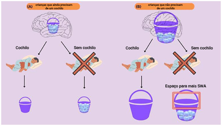(A) Quando as crianças são pequenas e seus baldes são pequenos, eles se enchem muito rapidamente, pois criam memórias ao longo do dia. Quando tiram uma soneca, esvaziam seus baldes para que possam enchê-los com mais memórias ao acordar. Se não tiram uma soneca, o balde permanece cheio e torna-se difícil criar novas memórias. (B) Crianças que não tiram mais sonecas têm hipocampos mais maduros, ou baldes maiores. Os cochilos ainda as ajudam a esvaziar seus baldes, mas, como seus baldes armazenam mais memórias, elas podem pular a hora da soneca e ainda ter espaço para mais memórias.