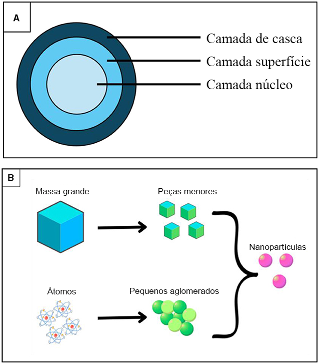 Os nanomateriais possuem um núcleo, seguido por uma camada superficial e, por fim, uma camada de casca na parte externa. (B) Os nanomateriais podem ser produzidos de duas maneiras. Um grande pedaço de material pode ser decomposto em pedaços menores (acima) ou componentes minúsculos, como átomos, podem ser unidos para formar pequenos aglomerados (abaixo).