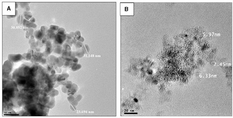 Os nanomateriais têm tamanhos e formas diferentes, o que pode ser observado com o TEM. Podemos observar que as nanopartículas de óxido de cobre (Figura 2A) são maiores que os nanodiamantes (Figura 2B). A maior partícula de óxido de cobre tem 31 nm, enquanto os maiores nanodiamantes têm 7 nm. Isso significa que o óxido de cobre é quase quatro vezes maior que os nanodiamantes!
