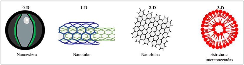 Figura 3 – Os nanomateriais apresentam diferentes formas e dimensões — de pontos a tubos, folhas e múltiplas estruturas unidas.